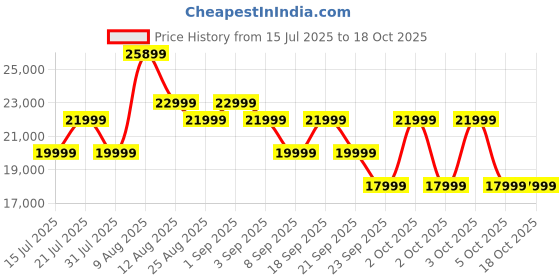 Good news! The current price of ₹17,999 is at its best ever level. Over the 95 day price history period, prices have ranged from ₹17,999 to ₹25,899, with an average of ₹20,934. The pricing shows moderate volatility, and the overall trend is favorable for consumers as prices are getting cheaper. In terms of recent activity, there have been 0 price changes this week, 5 this month, and 15 over the past year. This is an excellent time to make a purchase as prices are trending downward and conditions appear favorable.