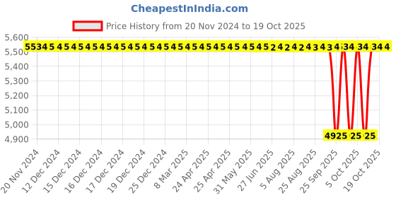 The current price is ₹5,534, which is ₹609 (12.4%) higher than the best price of ₹4,925 last seen on 25 Sep 2025. Over the 332 day price history period, prices have ranged from ₹4,925 to ₹5,535, with an average of ₹5,497. The pricing has been quite stable with low volatility, with prices remaining relatively stable overall. In terms of recent activity, there have been 0 price changes this week, 5 this month, and 47 over the past year. The price direction is uncertain, so monitor the situation for a few more days before making a decision.