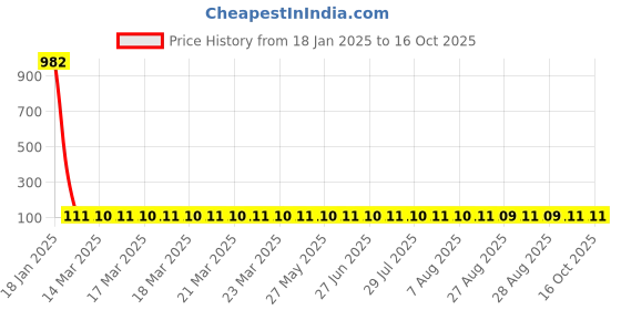 The current price is ₹111, which is ₹2 (1.8%) higher than the best price of ₹109 last seen on 27 Aug 2025. Over the 271 day price history period, prices have ranged from ₹109 to ₹982, with an average of ₹145. The pricing shows high volatility with significant fluctuations, and the overall trend is favorable for consumers as prices are getting cheaper. In terms of recent activity, there have been 0 price changes this week, 0 this month, and 23 over the past year. If you need this product now, it's a reasonable time to buy as prices are stable, but you might want to monitor for potential better deals.