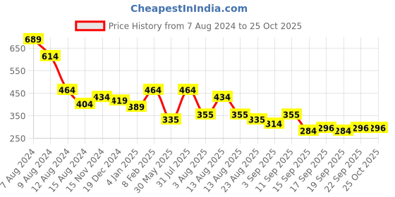 The current price is ₹296, which is ₹12 (4.2%) higher than the best price of ₹284 last seen on 15 Sep 2025. Over the 443 day price history period, prices have ranged from ₹284 to ₹689, with an average of ₹394. The pricing shows high volatility with significant fluctuations, and the overall trend is favorable for consumers as prices are getting cheaper. In terms of recent activity, there have been 0 price changes this week, 0 this month, and 15 over the past year. If you need this product now, it's a reasonable time to buy as prices are stable, but you might want to monitor for potential better deals.