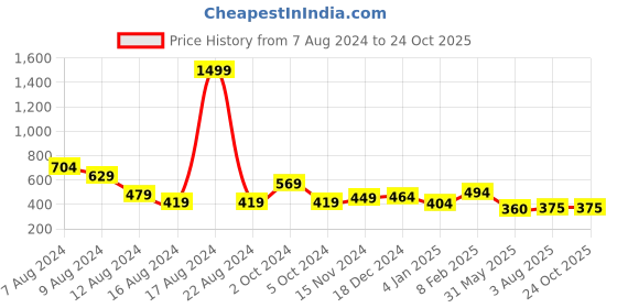 The current price is ₹375, which is ₹15 (4.2%) higher than the best price of ₹360 last seen on 31 May 2025. Over the 443 day price history period, prices have ranged from ₹360 to ₹1,499, with an average of ₹537. The pricing shows high volatility with significant fluctuations, and the overall trend is favorable for consumers as prices are getting cheaper. In terms of recent activity, there have been 0 price changes this week, 0 this month, and 5 over the past year. If you need this product now, it's a reasonable time to buy as prices are stable, but you might want to monitor for potential better deals.