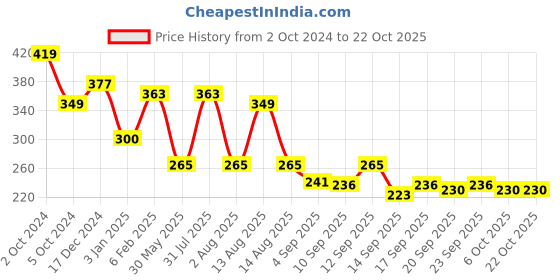 The current price is ₹230, which is ₹7 (3.1%) higher than the best price of ₹223 last seen on 14 Sep 2025. Over the 384 day price history period, prices have ranged from ₹223 to ₹419, with an average of ₹286. The pricing shows high volatility with significant fluctuations, and the overall trend is favorable for consumers as prices are getting cheaper. In terms of recent activity, there have been 0 price changes this week, 1 this month, and 15 over the past year. If you need this product now, it's a reasonable time to buy as prices are stable, but you might want to monitor for potential better deals.