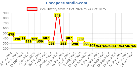 Awesome! The current price of ₹246 is at its best ever level. Over the 387 day price history period, prices have ranged from ₹246 to ₹849, with an average of ₹344. The pricing shows high volatility with significant fluctuations, and the overall trend is favorable for consumers as prices are getting cheaper. In terms of recent activity, there have been 0 price changes this week, 0 this month, and 18 over the past year. If you need this product now, it's a reasonable time to buy as prices are stable, but you might want to monitor for potential better deals.