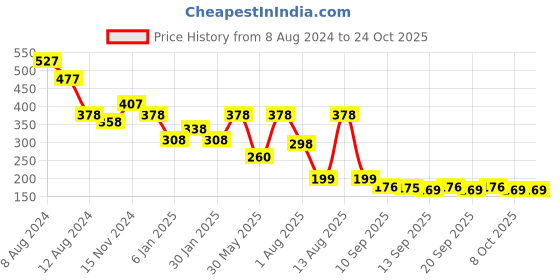 Awesome! The current price of ₹169 is at its best ever level. Over the 442 day price history period, prices have ranged from ₹169 to ₹527, with an average of ₹290. The pricing shows high volatility with significant fluctuations, and the overall trend is favorable for consumers as prices are getting cheaper. In terms of recent activity, there have been 0 price changes this week, 0 this month, and 18 over the past year. If you need this product now, it's a reasonable time to buy as prices are stable, but you might want to monitor for potential better deals.