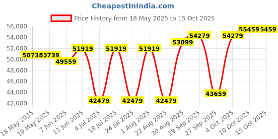 The current price is ₹55,459, which is ₹12,980 (30.6%) higher than the best price of ₹42,479 last seen on 4 Jul 2025. Over the 150 day price history period, prices have ranged from ₹42,479 to ₹55,459, with an average of ₹50,031. The pricing shows moderate volatility, but the overall trend is concerning as prices are getting more expensive. In terms of recent activity, there have been 0 price changes this week, 3 this month, and 13 over the past year. Consider waiting before making a purchase as prices are rising and better deals may be available later.