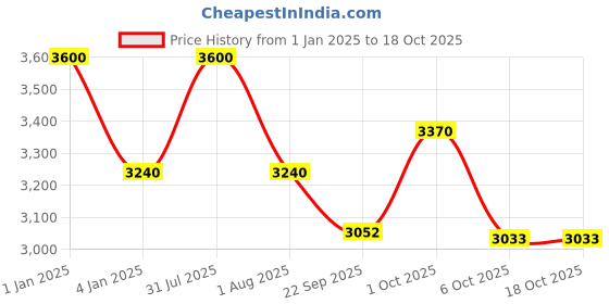 Fantastic! The current price of ₹3,033 is at its best ever level. Over the 290 day price history period, prices have ranged from ₹3,033 to ₹3,600, with an average of ₹3,271. The pricing shows moderate volatility, and the overall trend is favorable for consumers as prices are getting cheaper. In terms of recent activity, there have been 0 price changes this week, 2 this month, and 6 over the past year. This is an excellent time to make a purchase as prices are trending downward and conditions appear favorable.