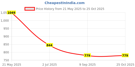 Great news for shoppers! The current price of ₹779 is at its best ever level. Over the 156 day price history period, prices have ranged from ₹779 to ₹1,049, with an average of ₹863. The pricing shows moderate volatility, and the overall trend is favorable for consumers as prices are getting cheaper. In terms of recent activity, there have been 0 price changes this week, 0 this month, and 2 over the past year. If you need this product now, it's a reasonable time to buy as prices are stable, but you might want to monitor for potential better deals.