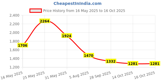 Exciting update! The current price of ₹1,281 is at its best ever level. Over the 153 day price history period, prices have ranged from ₹1,281 to ₹2,264, with an average of ₹1,608. The pricing shows high volatility with significant fluctuations, and the overall trend is favorable for consumers as prices are getting cheaper. In terms of recent activity, there have been 0 price changes this week, 1 this month, and 5 over the past year. If you need this product now, it's a reasonable time to buy as prices are stable, but you might want to monitor for potential better deals.