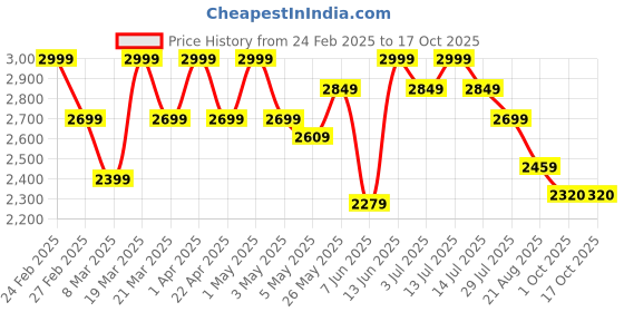 The current price is ₹2,320, which is ₹41 (1.8%) higher than the best price of ₹2,279 last seen on 7 Jun 2025. Over the 234 day price history period, prices have ranged from ₹2,279 to ₹2,999, with an average of ₹2,721. The pricing shows moderate volatility, and the overall trend is favorable for consumers as prices are getting cheaper. In terms of recent activity, there have been 0 price changes this week, 0 this month, and 18 over the past year. This is an excellent time to make a purchase as prices are trending downward and conditions appear favorable.