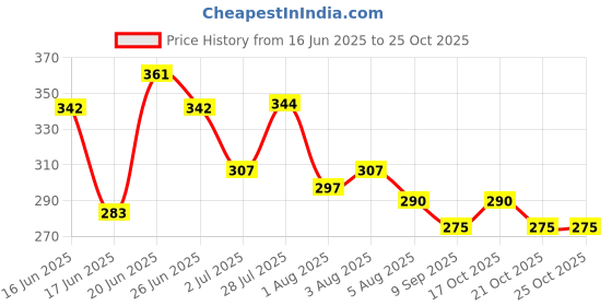 Awesome! The current price of ₹275 is at its best ever level. Over the 130 day price history period, prices have ranged from ₹275 to ₹361, with an average of ₹307. The pricing shows moderate volatility, and the overall trend is favorable for consumers as prices are getting cheaper. In terms of recent activity, there have been 0 price changes this week, 1 this month, and 11 over the past year. If you need this product now, it's a reasonable time to buy as prices are stable, but you might want to monitor for potential better deals.