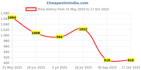 Fantastic! The current price of ₹910 is at its best ever level. Over the 138 day price history period, prices have ranged from ₹910 to ₹1,064, with an average of ₹985. The pricing shows moderate volatility, and the overall trend is favorable for consumers as prices are getting cheaper. In terms of recent activity, there have been 0 price changes this week, 0 this month, and 4 over the past year. This is an excellent time to make a purchase as prices are trending downward and conditions appear favorable.