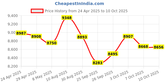 The current price is ₹8,656, which is ₹373 (4.5%) higher than the best price of ₹8,283 last seen on 25 Sep 2025. Over the 169 day price history period, prices have ranged from ₹8,283 to ₹9,348, with an average of ₹8,790. The pricing has been quite stable with low volatility, with prices remaining relatively stable overall. In terms of recent activity, there have been 0 price changes this week, 4 this month, and 9 over the past year. The price direction is uncertain, so monitor the situation for a few more days before making a decision.