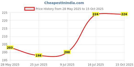 The current price is ₹224, which is ₹26 (13.1%) higher than the best price of ₹198 last seen on 25 Jun 2025. Over the 139 day price history period, prices have ranged from ₹198 to ₹224, with an average of ₹210. The pricing shows moderate volatility, but the overall trend is concerning as prices are getting more expensive. In terms of recent activity, there have been 0 price changes this week, 0 this month, and 3 over the past year. If you need this product now, it's a reasonable time to buy as prices are stable, but you might want to monitor for potential better deals.