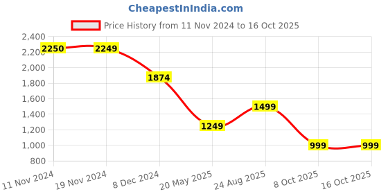 Great news for shoppers! The current price of ₹999 is at its best ever level. Over the 339 day price history period, prices have ranged from ₹999 to ₹2,250, with an average of ₹1,588. The pricing shows high volatility with significant fluctuations, and the overall trend is favorable for consumers as prices are getting cheaper. In terms of recent activity, there have been 0 price changes this week, 0 this month, and 5 over the past year. This is an excellent time to make a purchase as prices are trending downward and conditions appear favorable.