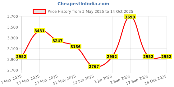 The current price is ₹2,952, which is ₹184.5 (6.7%) higher than the best price of ₹2,767.5 last seen on 12 Jun 2025. Over the 163 day price history period, prices have ranged from ₹2,767.5 to ₹3,690, with an average of ₹3,120. The pricing shows moderate volatility, with prices remaining relatively stable overall. In terms of recent activity, there have been 0 price changes this week, 0 this month, and 7 over the past year. The price direction is uncertain, so monitor the situation for a few more days before making a decision.