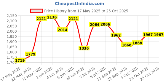 The current price is ₹1,967, which is ₹248 (14.4%) higher than the best price of ₹1,719 last seen on 17 May 2025. Over the 160 day price history period, prices have ranged from ₹1,719 to ₹2,136, with an average of ₹1,965. The pricing shows moderate volatility, but the overall trend is concerning as prices are getting more expensive. In terms of recent activity, there have been 0 price changes this week, 1 this month, and 12 over the past year. If you need this product now, it's a reasonable time to buy as prices are stable, but you might want to monitor for potential better deals.