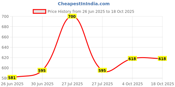 The current price is ₹618, which is ₹37 (6.4%) higher than the best price of ₹581 last seen on 26 Jun 2025. Over the 114 day price history period, prices have ranged from ₹581 to ₹700, with an average of ₹618. The pricing shows moderate volatility, but the overall trend is concerning as prices are getting more expensive. In terms of recent activity, there have been 0 price changes this week, 0 this month, and 4 over the past year. If you need this product now, it's a reasonable time to buy as prices are stable, but you might want to monitor for potential better deals.