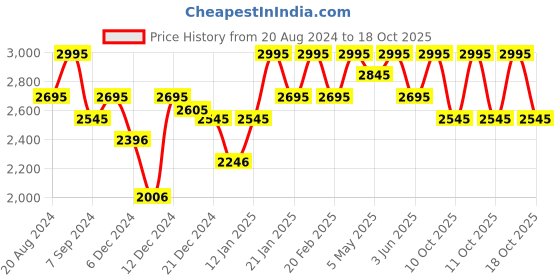 The current price is ₹2,545, which is ₹539 (26.9%) higher than the best price of ₹2,006 last seen on 10 Dec 2024. Over the 424 day price history period, prices have ranged from ₹2,006 to ₹2,995, with an average of ₹2,700. The pricing shows moderate volatility, and the overall trend is favorable for consumers as prices are getting cheaper. In terms of recent activity, there has been 1 price change this week, 4 this month, and 21 over the past year. If you need this product now, it's a reasonable time to buy as prices are stable, but you might want to monitor for potential better deals.