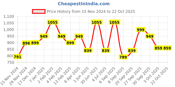 The current price is ₹859, which is ₹70 (8.9%) higher than the best price of ₹789 last seen on 8 Sep 2025. Over the 340 day price history period, prices have ranged from ₹789 to ₹1,055, with an average of ₹915. The pricing shows moderate volatility, but the overall trend is concerning as prices are getting more expensive. In terms of recent activity, there have been 0 price changes this week, 2 this month, and 16 over the past year. If you need this product now, it's a reasonable time to buy as prices are stable, but you might want to monitor for potential better deals.