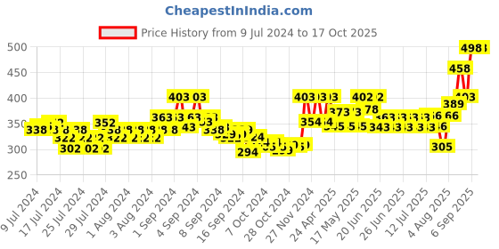 The current price is ₹498, which is ₹204 (69.4%) higher than the best price of ₹294 last seen on 17 Sep 2024. Over the 464 day price history period, prices have ranged from ₹294 to ₹498, with an average of ₹350. The pricing shows moderate volatility, but the overall trend is concerning as prices are getting more expensive. In terms of recent activity, there have been 0 price changes this week, 0 this month, and 34 over the past year. If you need this product now, it's a reasonable time to buy as prices are stable, but you might want to monitor for potential better deals.