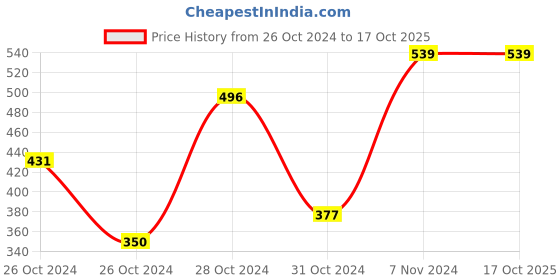 The current price is ₹539, which is ₹189 (54.0%) higher than the best price of ₹350 last seen on 26 Oct 2024. Over the 355 day price history period, prices have ranged from ₹350 to ₹539, with an average of ₹455. The pricing shows high volatility with significant fluctuations, but the overall trend is concerning as prices are getting more expensive. In terms of recent activity, there have been 0 price changes this week, 0 this month, and 4 over the past year. Consider waiting before making a purchase as prices are rising and better deals may be available later.