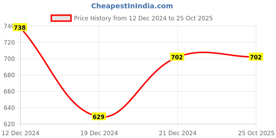 The current price is ₹702, which is ₹73 (11.6%) higher than the best price of ₹629 last seen on 19 Dec 2024. Over the 316 day price history period, prices have ranged from ₹629 to ₹738, with an average of ₹693. The pricing shows moderate volatility, with prices remaining relatively stable overall. In terms of recent activity, there have been 0 price changes this week, 0 this month, and 2 over the past year. If you need this product now, it's a reasonable time to buy as prices are stable, but you might want to monitor for potential better deals.