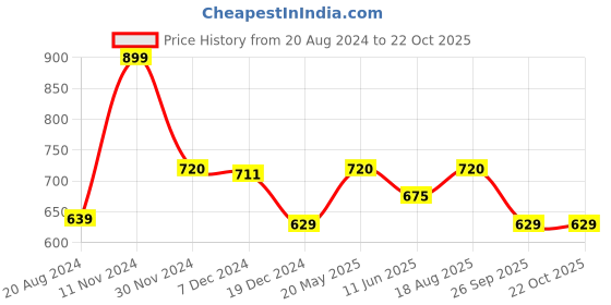 Exciting update! The current price of ₹629 is at its best ever level. Over the 427 day price history period, prices have ranged from ₹629 to ₹899, with an average of ₹697. The pricing shows moderate volatility, with prices remaining relatively stable overall. In terms of recent activity, there have been 0 price changes this week, 0 this month, and 7 over the past year. If you need this product now, it's a reasonable time to buy as prices are stable, but you might want to monitor for potential better deals.