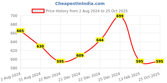 Great news for shoppers! The current price of ₹595 is at its best ever level. Over the 448 day price history period, prices have ranged from ₹595 to ₹699, with an average of ₹629. The pricing shows moderate volatility, and the overall trend is favorable for consumers as prices are getting cheaper. In terms of recent activity, there have been 0 price changes this week, 0 this month, and 4 over the past year. This is an excellent time to make a purchase as prices are trending downward and conditions appear favorable.