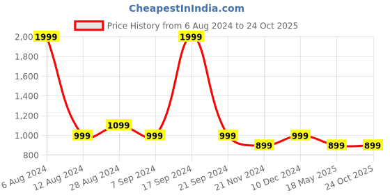 Exciting update! The current price of ₹899 is at its best ever level. Over the 444 day price history period, prices have ranged from ₹899 to ₹1,999, with an average of ₹1,179. The pricing shows high volatility with significant fluctuations, and the overall trend is favorable for consumers as prices are getting cheaper. In terms of recent activity, there have been 0 price changes this week, 0 this month, and 2 over the past year. If you need this product now, it's a reasonable time to buy as prices are stable, but you might want to monitor for potential better deals.