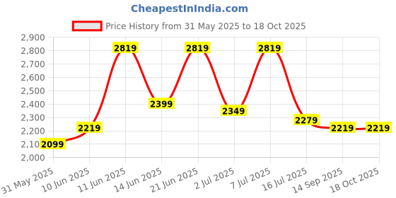 The current price is ₹2,219, which is ₹120 (5.7%) higher than the best price of ₹2,099 last seen on 31 May 2025. Over the 140 day price history period, prices have ranged from ₹2,099 to ₹2,819, with an average of ₹2,424. The pricing shows moderate volatility, but the overall trend is concerning as prices are getting more expensive. In terms of recent activity, there have been 0 price changes this week, 0 this month, and 8 over the past year. If you need this product now, it's a reasonable time to buy as prices are stable, but you might want to monitor for potential better deals.