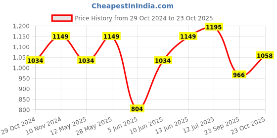 The current price is ₹1,058, which is ₹254 (31.6%) higher than the best price of ₹804 last seen on 5 Jun 2025. Over the 359 day price history period, prices have ranged from ₹804 to ₹1,195, with an average of ₹1,057. The pricing shows moderate volatility, with prices remaining relatively stable overall. In terms of recent activity, there have been 0 price changes this week, 0 this month, and 9 over the past year. The price direction is uncertain, so monitor the situation for a few more days before making a decision.