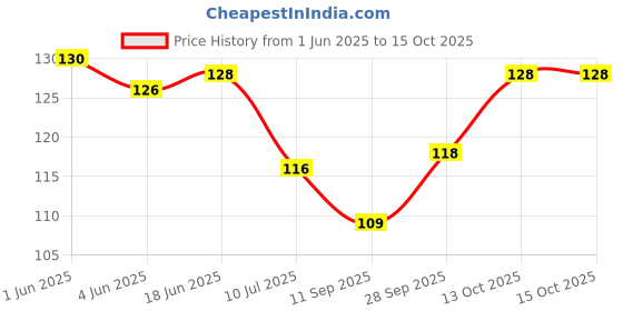 The current price is ₹128, which is ₹19 (17.4%) higher than the best price of ₹109 last seen on 11 Sep 2025. Over the 136 day price history period, prices have ranged from ₹109 to ₹130, with an average of ₹123. The pricing shows moderate volatility, with prices remaining relatively stable overall. In terms of recent activity, there have been 0 price changes this week, 1 this month, and 6 over the past year. If you need this product now, it's a reasonable time to buy as prices are stable, but you might want to monitor for potential better deals.
