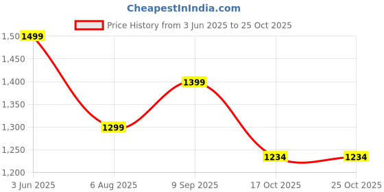 Good news! The current price of ₹1,234 is at its best ever level. Over the 143 day price history period, prices have ranged from ₹1,234 to ₹1,499, with an average of ₹1,333. The pricing shows moderate volatility, and the overall trend is favorable for consumers as prices are getting cheaper. In terms of recent activity, there have been 0 price changes this week, 0 this month, and 3 over the past year. This is an excellent time to make a purchase as prices are trending downward and conditions appear favorable.