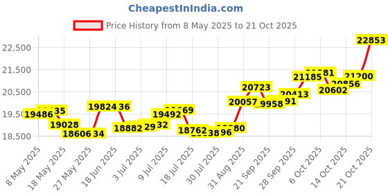 The current price is ₹22,853, which is ₹4,247 (22.8%) higher than the best price of ₹18,606 last seen on 24 May 2025. Over the 166 day price history period, prices have ranged from ₹18,606 to ₹22,853, with an average of ₹19,828. The pricing shows moderate volatility, but the overall trend is concerning as prices are getting more expensive. In terms of recent activity, there has been 1 price change this week, 7 this month, and 26 over the past year. Consider waiting before making a purchase as prices are rising and better deals may be available later.