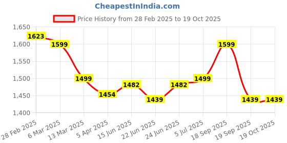 Awesome! The current price of ₹1,439 is at its best ever level. Over the 232 day price history period, prices have ranged from ₹1,439 to ₹1,623, with an average of ₹1,505. The pricing has been quite stable with low volatility, and the overall trend is favorable for consumers as prices are getting cheaper. In terms of recent activity, there have been 0 price changes this week, 0 this month, and 9 over the past year. This is an excellent time to make a purchase as prices are trending downward and conditions appear favorable.