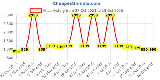 The current price is ₹990, which is ₹91 (10.1%) higher than the best price of ₹899 last seen on 27 Oct 2024. Over the 356 day price history period, prices have ranged from ₹899 to ₹2,999, with an average of ₹1,541. The pricing shows high volatility with significant fluctuations, but the overall trend is concerning as prices are getting more expensive. In terms of recent activity, there have been 0 price changes this week, 0 this month, and 15 over the past year. If you need this product now, it's a reasonable time to buy as prices are stable, but you might want to monitor for potential better deals.