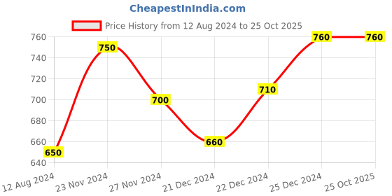 The current price is ₹760, which is ₹110 (16.9%) higher than the best price of ₹650 last seen on 12 Aug 2024. Over the 438 day price history period, prices have ranged from ₹650 to ₹760, with an average of ₹713. The pricing shows moderate volatility, but the overall trend is concerning as prices are getting more expensive. In terms of recent activity, there have been 0 price changes this week, 0 this month, and 4 over the past year. If you need this product now, it's a reasonable time to buy as prices are stable, but you might want to monitor for potential better deals.