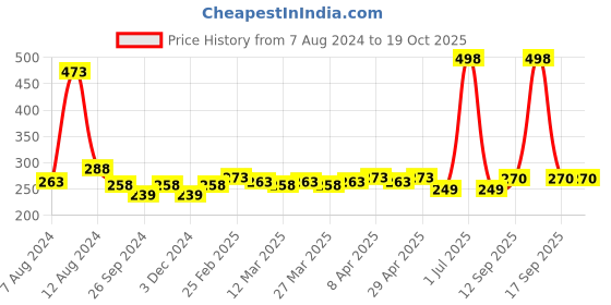 The current price is ₹270, which is ₹31 (13.0%) higher than the best price of ₹239 last seen on 26 Sep 2024. Over the 437 day price history period, prices have ranged from ₹239 to ₹498, with an average of ₹290. The pricing shows high volatility with significant fluctuations, with prices remaining relatively stable overall. In terms of recent activity, there have been 0 price changes this week, 0 this month, and 16 over the past year. The price direction is uncertain, so monitor the situation for a few more days before making a decision.