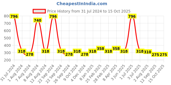 Awesome! The current price of ₹275 is at its best ever level. Over the 440 day price history period, prices have ranged from ₹275 to ₹796, with an average of ₹404. The pricing shows high volatility with significant fluctuations, and the overall trend is favorable for consumers as prices are getting cheaper. In terms of recent activity, there have been 0 price changes this week, 0 this month, and 9 over the past year. If you need this product now, it's a reasonable time to buy as prices are stable, but you might want to monitor for potential better deals.