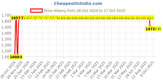 The current price is ₹1,470, which is ₹470 (47.0%) higher than the best price of ₹1,000 last seen on 28 Oct 2024. Over the 353 day price history period, prices have ranged from ₹1,000 to ₹1,657, with an average of ₹1,634. The pricing shows moderate volatility, but the overall trend is concerning as prices are getting more expensive. In terms of recent activity, there have been 0 price changes this week, 3 this month, and 101 over the past year. If you need this product now, it's a reasonable time to buy as prices are stable, but you might want to monitor for potential better deals.