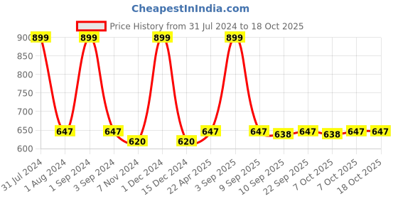 The current price is ₹647, which is ₹27 (4.4%) higher than the best price of ₹620 last seen on 7 Nov 2024. Over the 444 day price history period, prices have ranged from ₹620 to ₹899, with an average of ₹709. The pricing shows high volatility with significant fluctuations, and the overall trend is favorable for consumers as prices are getting cheaper. In terms of recent activity, there have been 0 price changes this week, 2 this month, and 9 over the past year. If you need this product now, it's a reasonable time to buy as prices are stable, but you might want to monitor for potential better deals.