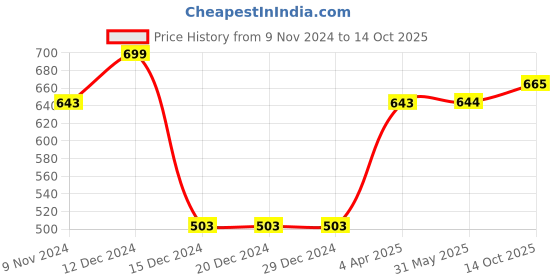 The current price is ₹665, which is ₹162 (32.2%) higher than the best price of ₹503 last seen on 20 Dec 2024. Over the 339 day price history period, prices have ranged from ₹503 to ₹699, with an average of ₹600. The pricing shows moderate volatility, with prices remaining relatively stable overall. In terms of recent activity, there have been 0 price changes this week, 0 this month, and 7 over the past year. If you need this product now, it's a reasonable time to buy as prices are stable, but you might want to monitor for potential better deals.