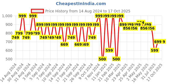 The current price is ₹699, which is ₹199 (39.8%) higher than the best price of ₹500 last seen on 9 Jan 2025. Over the 428 day price history period, prices have ranged from ₹500 to ₹999, with an average of ₹820. The pricing shows high volatility with significant fluctuations, and the overall trend is favorable for consumers as prices are getting cheaper. In terms of recent activity, there have been 0 price changes this week, 0 this month, and 18 over the past year. If you need this product now, it's a reasonable time to buy as prices are stable, but you might want to monitor for potential better deals.