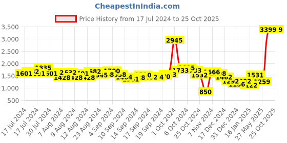 The current price is ₹3,399, which is ₹2,549 (299.9%) higher than the best price of ₹850 last seen on 30 Oct 2024. Over the 464 day price history period, prices have ranged from ₹850 to ₹3,399, with an average of ₹1,635. The pricing shows high volatility with significant fluctuations, but the overall trend is concerning as prices are getting more expensive. In terms of recent activity, there have been 0 price changes this week, 0 this month, and 11 over the past year. Consider waiting before making a purchase as prices are rising and better deals may be available later.