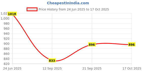 The current price is ₹896, which is ₹63 (7.6%) higher than the best price of ₹833 last seen on 12 Sep 2025. Over the 114 day price history period, prices have ranged from ₹833 to ₹1,018, with an average of ₹911. The pricing shows moderate volatility, and the overall trend is favorable for consumers as prices are getting cheaper. In terms of recent activity, there have been 0 price changes this week, 0 this month, and 2 over the past year. If you need this product now, it's a reasonable time to buy as prices are stable, but you might want to monitor for potential better deals.
