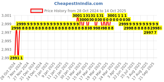 The current price is ₹2,998, which is ₹7 (0.2%) higher than the best price of ₹2,991 last seen on 28 Oct 2024. Over the 350 day price history period, prices have ranged from ₹2,991 to ₹3,001, with an average of ₹2,999. The pricing has been quite stable with low volatility, with prices remaining relatively stable overall. In terms of recent activity, there have been 0 price changes this week, 4 this month, and 85 over the past year. If you need this product now, it's a reasonable time to buy as prices are stable, but you might want to monitor for potential better deals.