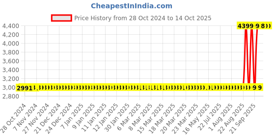The current price is ₹4,400, which is ₹1,409 (47.1%) higher than the best price of ₹2,991 last seen on 28 Oct 2024. Over the 350 day price history period, prices have ranged from ₹2,991 to ₹4,400, with an average of ₹3,082. The pricing shows moderate volatility, but the overall trend is concerning as prices are getting more expensive. In terms of recent activity, there have been 0 price changes this week, 5 this month, and 82 over the past year. If you need this product now, it's a reasonable time to buy as prices are stable, but you might want to monitor for potential better deals.