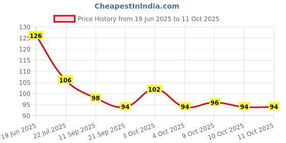 Exciting update! The current price of ₹94 is at its best ever level. Over the 113 day price history period, prices have ranged from ₹94 to ₹126, with an average of ₹101. The pricing shows moderate volatility, and the overall trend is favorable for consumers as prices are getting cheaper. In terms of recent activity, there have been 2 price changes this week, 5 this month, and 7 over the past year. If you need this product now, it's a reasonable time to buy as prices are stable, but you might want to monitor for potential better deals.
