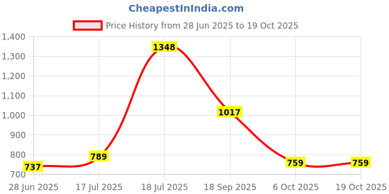 The current price is ₹759, which is ₹22 (3.0%) higher than the best price of ₹737 last seen on 28 Jun 2025. Over the 112 day price history period, prices have ranged from ₹737 to ₹1,348, with an average of ₹902. The pricing shows high volatility with significant fluctuations, with prices remaining relatively stable overall. In terms of recent activity, there have been 0 price changes this week, 0 this month, and 4 over the past year. The price direction is uncertain, so monitor the situation for a few more days before making a decision.