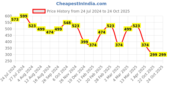 Great news for shoppers! The current price of ₹299 is at its best ever level. Over the 457 day price history period, prices have ranged from ₹299 to ₹599, with an average of ₹465. The pricing shows high volatility with significant fluctuations, and the overall trend is favorable for consumers as prices are getting cheaper. In terms of recent activity, there have been 0 price changes this week, 0 this month, and 9 over the past year. If you need this product now, it's a reasonable time to buy as prices are stable, but you might want to monitor for potential better deals.